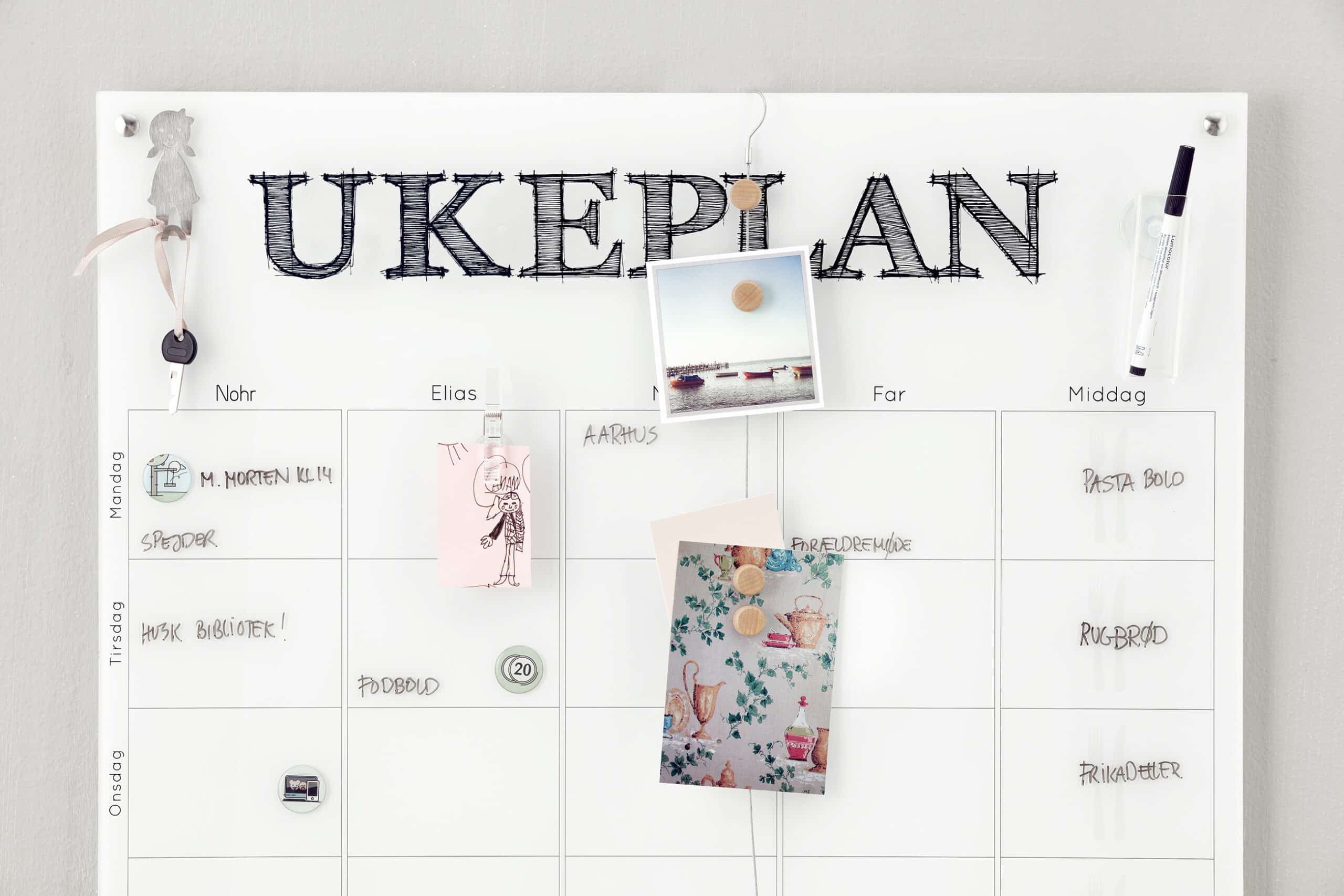 Lag din egen personlige ukeplanlegger med bilder av din familie. Tilpass planen slik du ønsker etter din familie sitt behov. Våre ekslusive plexiglasstavler har print på baksiden slik at du kan skrive på hele fremsiden med whiteboardtusj. På ukeplantavlen kan dere skrive opp alle ukens gjøremål som treninger, viktige møter, middagsplan, bursdager og så videre. Da kan alle i familien selv holde kontroll og se selv om de lurer på noe. Visuelt sett er en ukeplan et smykke som fortjener en hedersplass på feks ditt kjøkken! Alle ukeplaner kommer med 4 stilige veggfester som gjør at ukeplanen svever ca 1,5 cm ut ifra veggen.